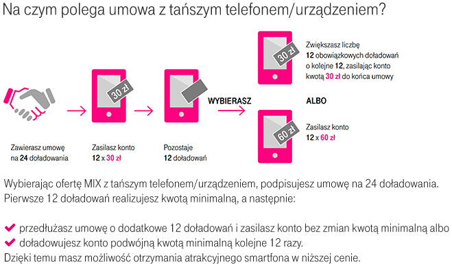 Niższa cena telefonu obowiązuje dla klientów T-Mobile na kartę i Heyah na kartę o nieprzerwanym stażu 90 dni, przenoszących numer z karty do Mix. Wyższa cena telefonu obowiązuje w ofercie „Mix na liczbę doładowań”. Podane ceny dotyczą opcji na 24 doładowania z tańszym telefonem.