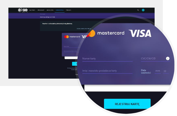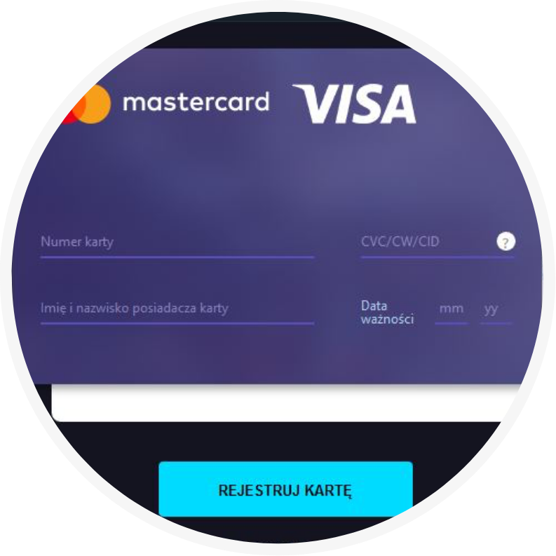 Wprowadź dane swojej karty płatniczej i kliknij w przycik "REJESTRUJ KARTĘ". Opłata z karty zostanie pobrana przy przedłużeniu, za 30 dni. W każdej chwili możesz wyłączyć płatności automatyczne.