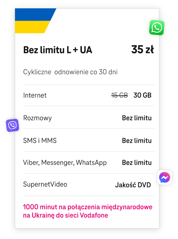 Po doładowaniu aktywuj dedykowany Pakiet Bez limitu L+UA lub wybierz starter z już włączoną ofertą.