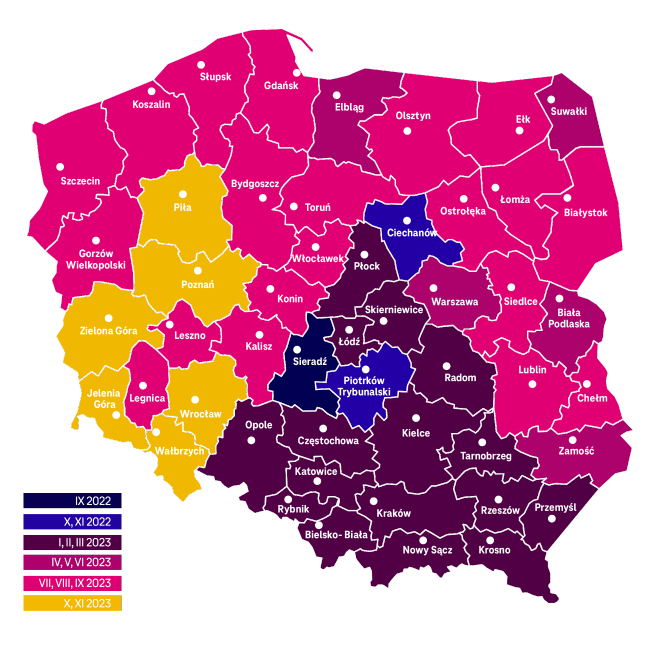 We wrześniu 2022 rozpoczynamy wyłączanie technologię 3G w naszej sieci. Proces ten podzielony jest na etapy i ma zakończyć się z końcem 2023. Poniżej na mapie możesz zobaczyć kolejne obszary na jakich będziemy modernizować sieć.