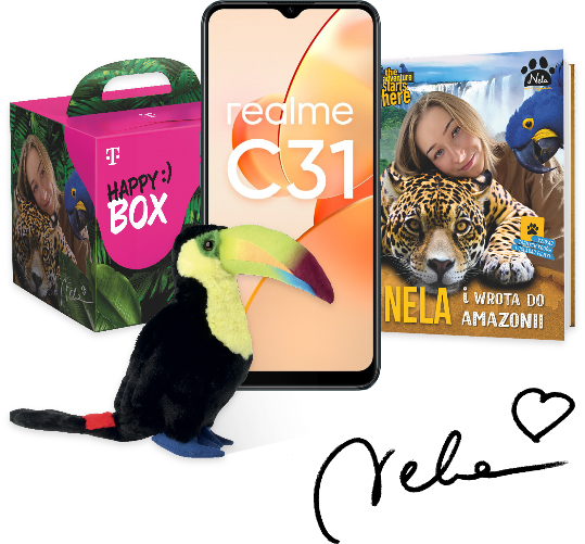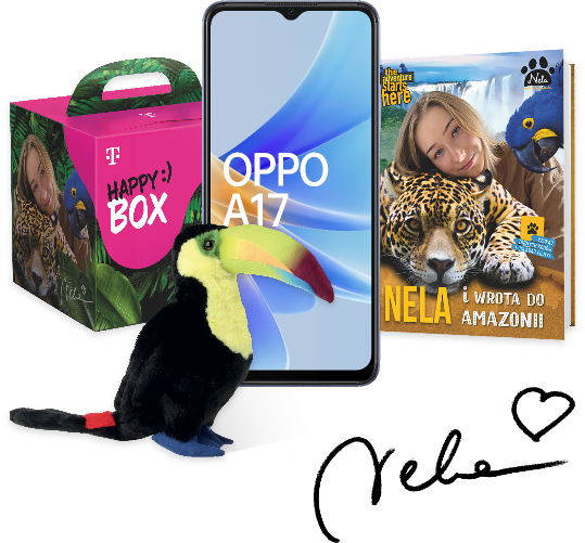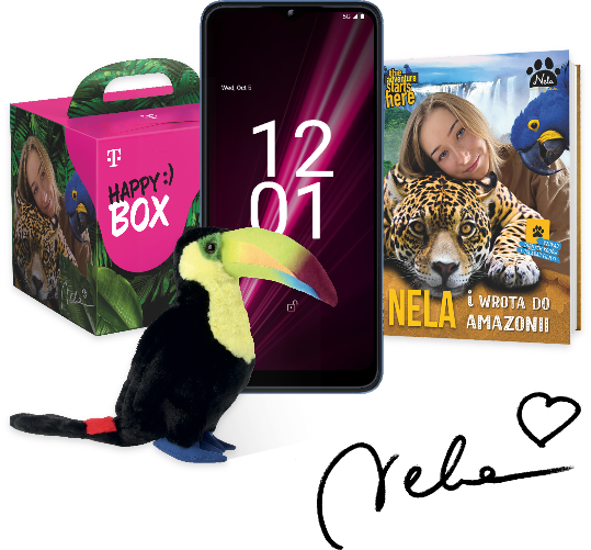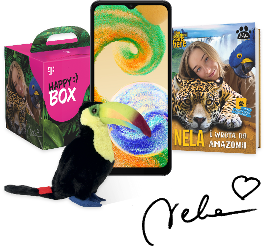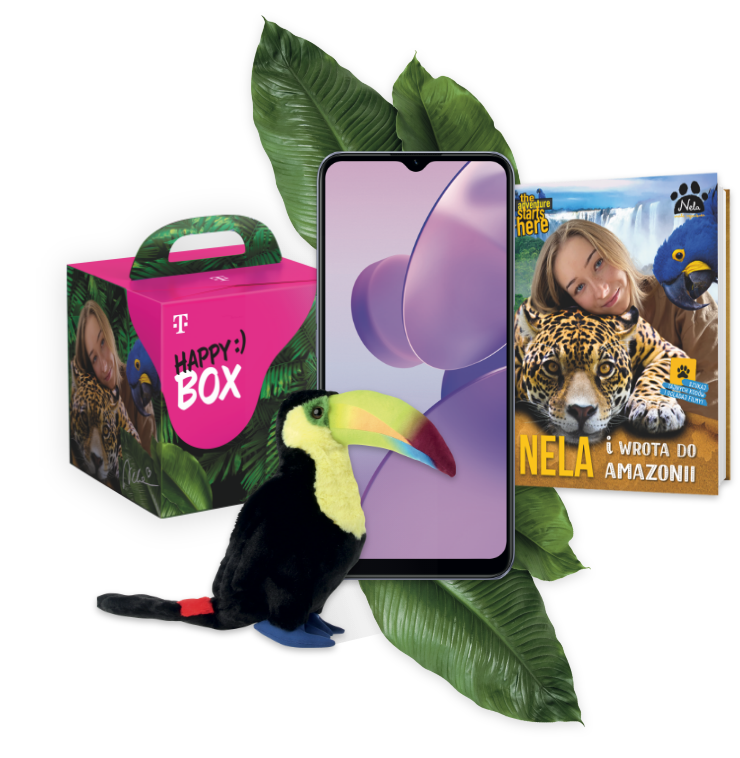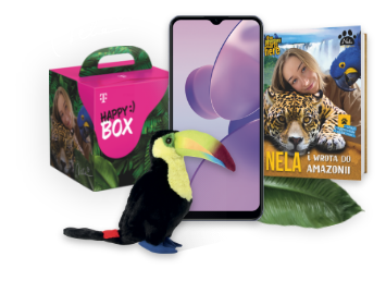 Wyjątkowy zestawy Happy BOX, w którym dzieci znajdą najnowszy smartfon, książkę Neli Małej Reporterki o fascynującej Amazonii i maskotkę tukana.