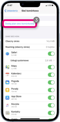 Wybierz Ustawienia (1), następnie Sieć komórkowa (2) i następnie Dodaj plan sieci komórkowej (3)