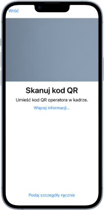 Zostanie wyświetlony ekran oknem do skanowania kodu QR. Umieść kod QR w obszarze skanowania. Kod QR znajdziesz w mailu otrzymanym od T-Mobile.