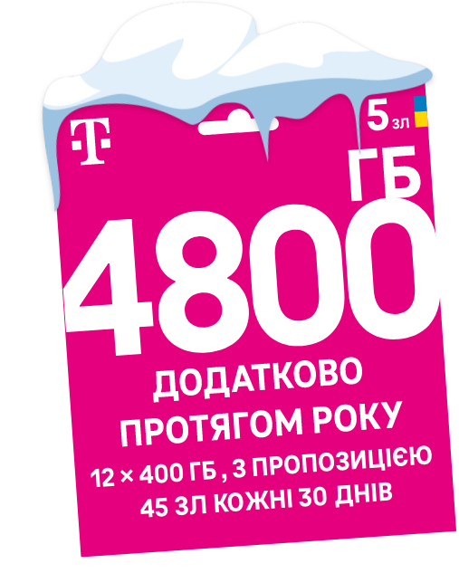 «4800 ГБ додатково на рік із потужністю 5G 12 × 400 ГБ із пропозицією 45 зл кожні 30 днів» — це 12 Пакетів по 400 ГБ кожен, які можна використовувати протягом 365 днів, рахуючи від активації першого Пакету, який надається кожні 30 днів з-за умови поновлення циклічної пропозиції GO! L зазначеною в правилах пропозиції «Рік Інтернету». Більше про доступ до 5G в пропозиції GO! L на www.t-mobile.pl/5g.. Деталі у відповідних правилах пропозицій, та на сайті www.t-mobile.pl для користувачів T-Mobile на карту у тарифі GO! Пропозиція діє з 1.10.2023 р.