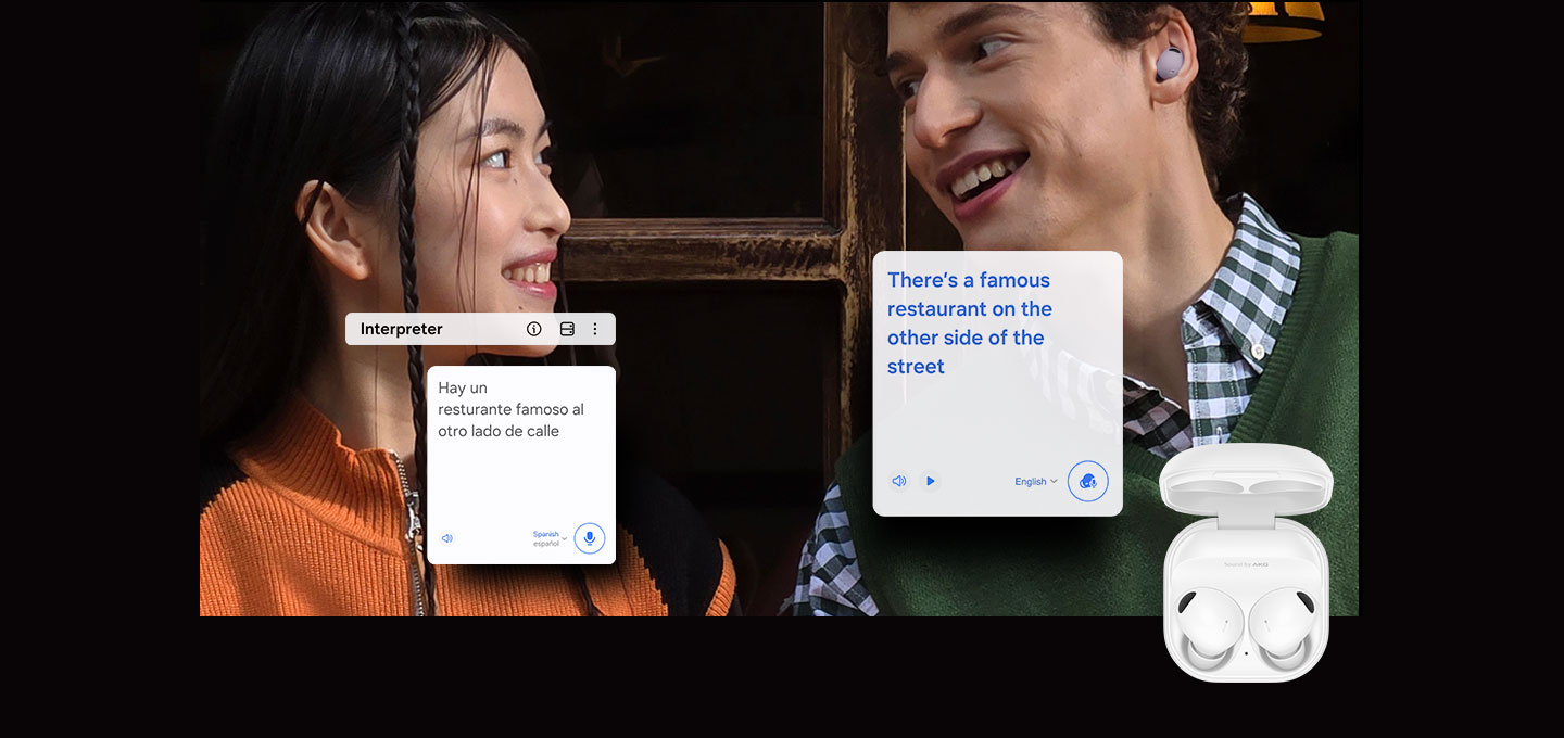 Tłumaczenie rozmów w czasie rzeczywistym jest teraz dziecinnie proste dzięki funkcji Interpreter (Tłumacz) na Twoim smartfonie Galaxy. Dodatkowo, dzięki słuchawkom Galaxy Buds możesz swobodnie wypowiadać swoje myśli i pozwolić, aby język ciała pomógł Ci wyrazić siebie. Nie ma potrzeby podawania telefonu w tę i z powrotem. Teraz możesz rozmawiać bez przeszkód!