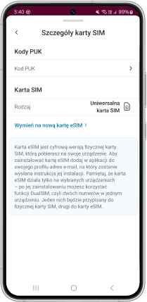 Dostępna jest możliwość zlecenia wymiany karty na eSIM poprzez kliknięcie w "Wymień na nową kartę eSIM".