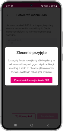 Po potwierdzeniu złożenia zamówienia wymiany karty na eSIM pojawia się popup informujący o trwającym procesie wymiany karty eSIM.