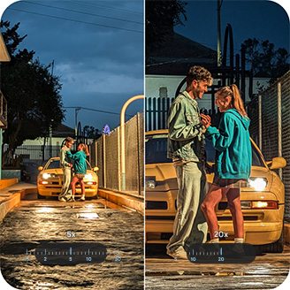 Funkcja filmów w trybie nocnym pozwala nagrywać wyraźne filmy przy słabym oświetleniu, na przykład w restauracjach czy podczas podziwiania panoramy miasta nocą. Efekt: bogactwo szczegółów i kolorów, nawet gdy jest ciemno.