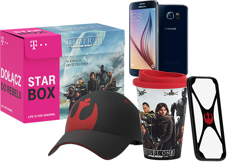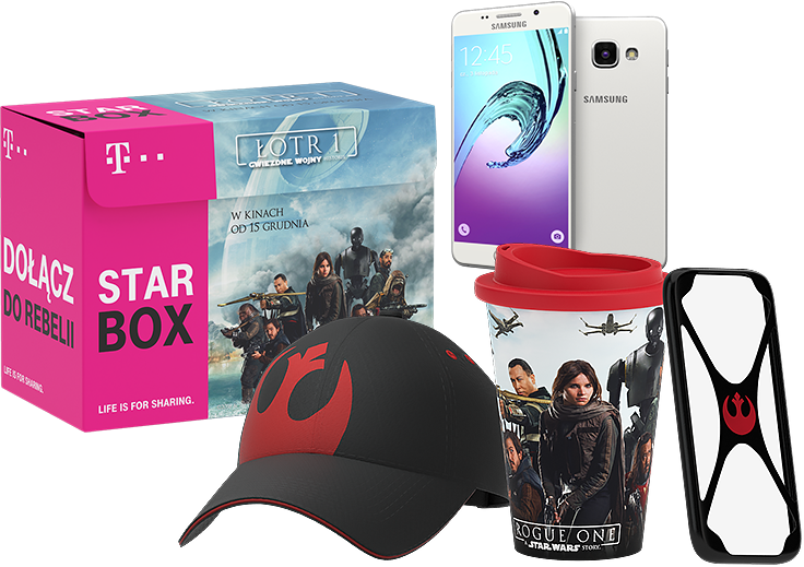 Zestaw Star Box składa się z: czapki, kubka termicznego oraz uniwersalnego etui na telefon z logo Rouge One i dodawany jest do każdego zakupionego telefonu Samsung Galaxy A3 (2016) oraz Samsung Galaxy S6. Zestawy Star Box dostępne do wyczerpania zapasów. Samsung Galaxy A3 (2016) dostępny jest na raty w ofertach „Taryfa T z telefonem „6x1” na 24 miesiące Raty w T-Mobile / TMUB” oraz „Taryfa T z telefonem WWW na 24 miesiące Raty w T-Mobile / TMUB” za 1 zł na start z opłatą miesięczną 79,95 zł zawierającą abonament i ratę za sprzęt oraz rabat za zgody marketingowe. Model dostępny również w innych ofertach z Taryfą T. Szczegóły na www.t-mobile.pl. Samsung Galaxy S6 dostępny jest na raty w ofercie „Oferty T2 z Samsung GalaxyS6 - 24 lub 36 Rat w T-Mobile / TMUB” za 199 zł na start z opłatą miesięczną 99,95 zł zawierającą abonament i ratę za sprzęt oraz rabat za zgody marketingowe. Model dostępny również w innych ofertach z Taryfą T. Szczegóły na www.t-mobile.pl. Brak zmniejszenia limitu danych dotyczy korzystania z aplikacji mobilnych serwisów i ograniczony jest do wskazanego w ofertach zakresu korzystania z poszczególnych aplikacji. Liczba i rodzaj serwisów mogą ulec zmianie.