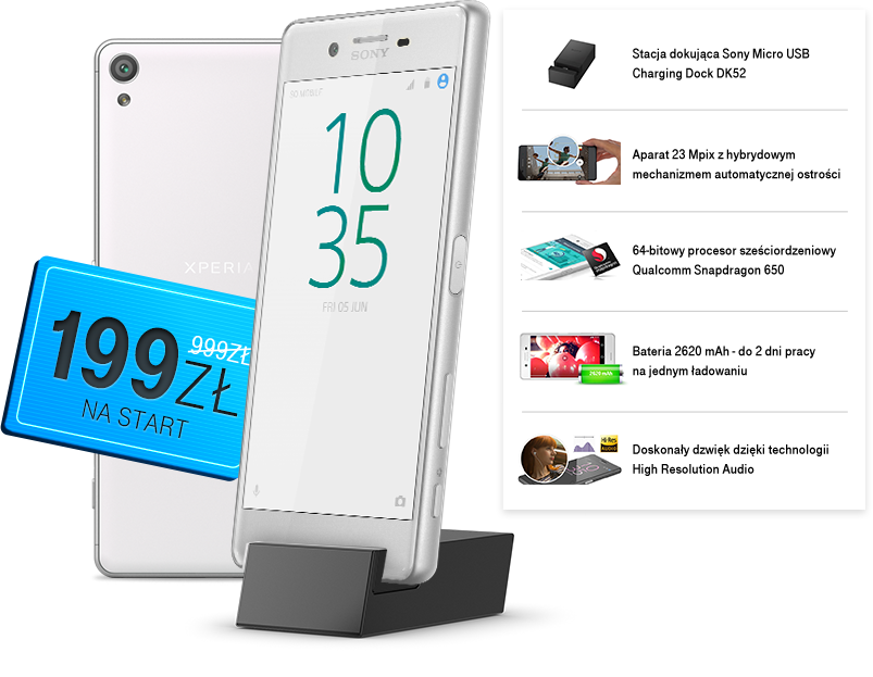Sony Xperia™ X dostępny jest na raty w ofercie „Oferty T2 Smartfoneria 24 lub 36 Rat w T-Mobile/TMUB” za 199 zł na start z opłatą miesięczną 99,95 zł, obejmującą abonament i ratę za urządzenie oraz rabat za zgody marketingowe. Umowa na 24 miesiące, raty za urządzenie rozłożone na 24 miesiące. W usłudze Supernet bez limitu danych w Polsce, po przekroczeniu 20 GB w cyklu, prędkość transmisji ulegnie obniżeniu do maks. 1 Mb/s do końca tego cyklu. Brak zmniejszenia limitu danych dotyczy korzystania z aplikacji mobilnych serwisów i ograniczony jest do wskazanego w ofertach zakresu korzystania z poszczególnych aplikacji. Liczba i rodzaj serwisów mogą ulec zmianie. Szczegóły na www.t-mobile.pl i w sklepach.